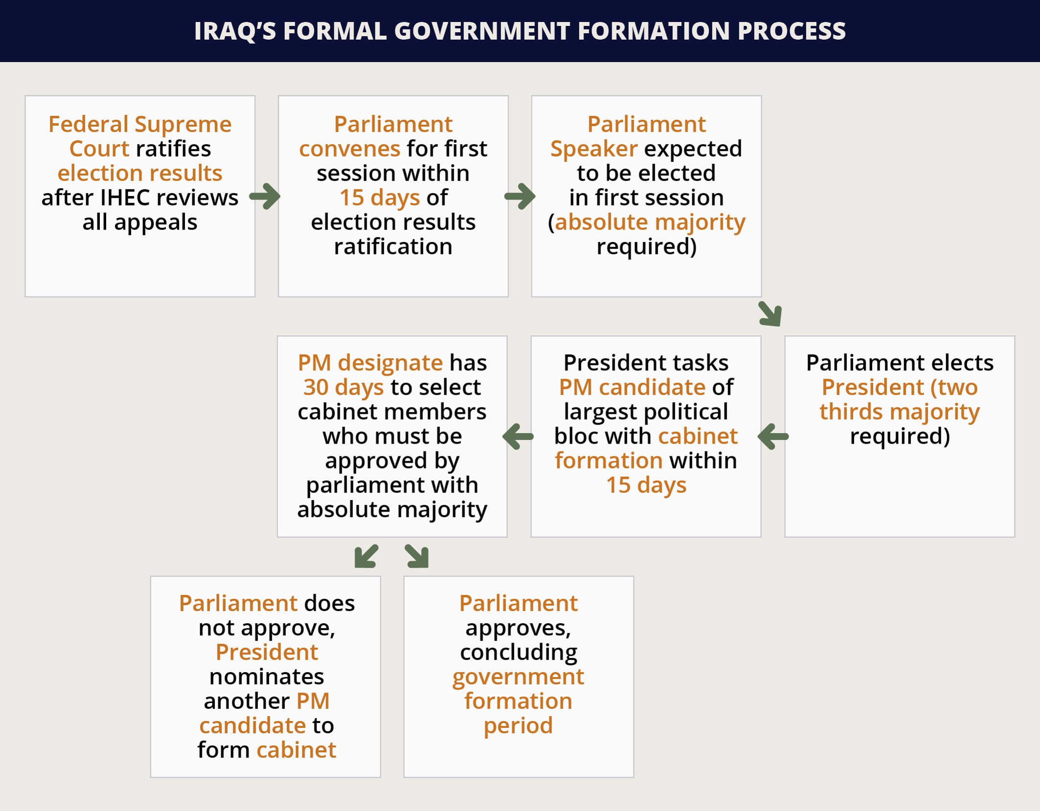 - The sequential nature of the government formation process constitutes a potential bottleneck and may cause a prolonged deadlock, particularly given internal disagreements between the Sunni and Kurdish political parties.