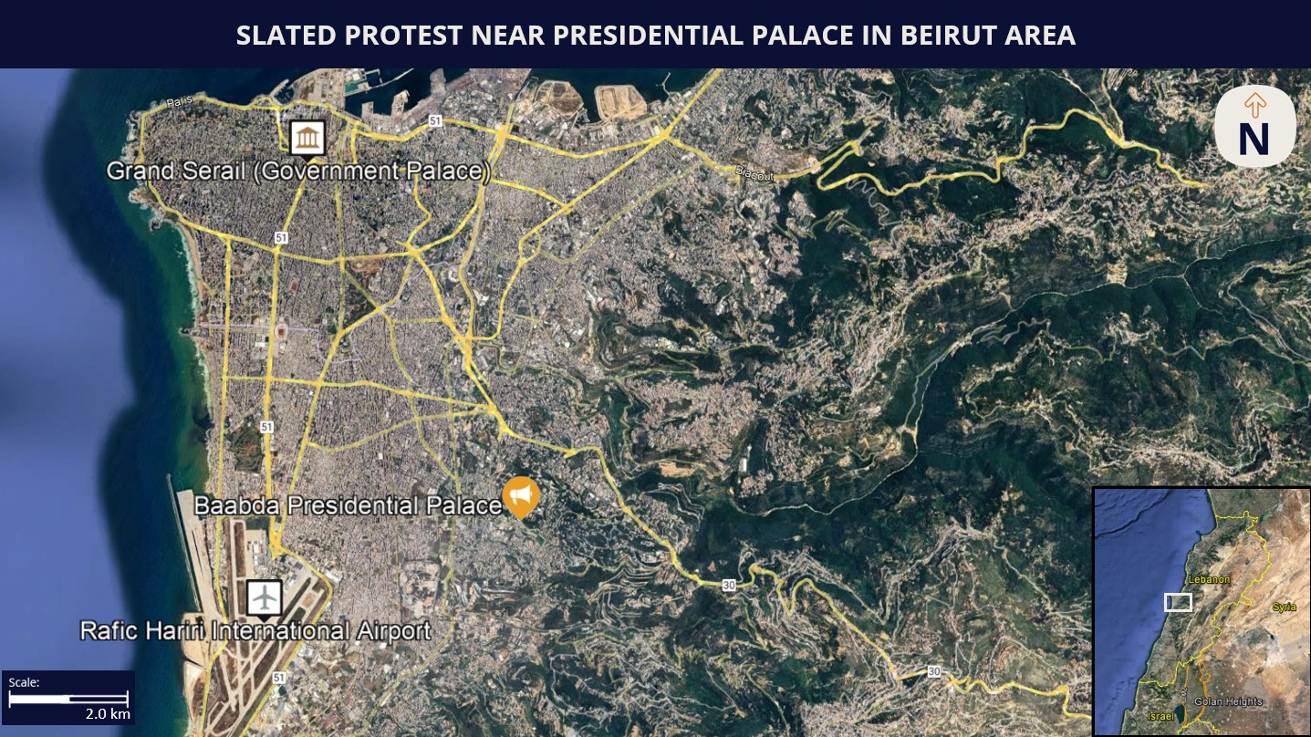 Those operating or residing in Baabda during the afternoon hours on December 22 are advised to maintain heightened vigilance and allot for travel disruptions due to the slated protest around the Presidential Palace and the associated risk of localized unrest.