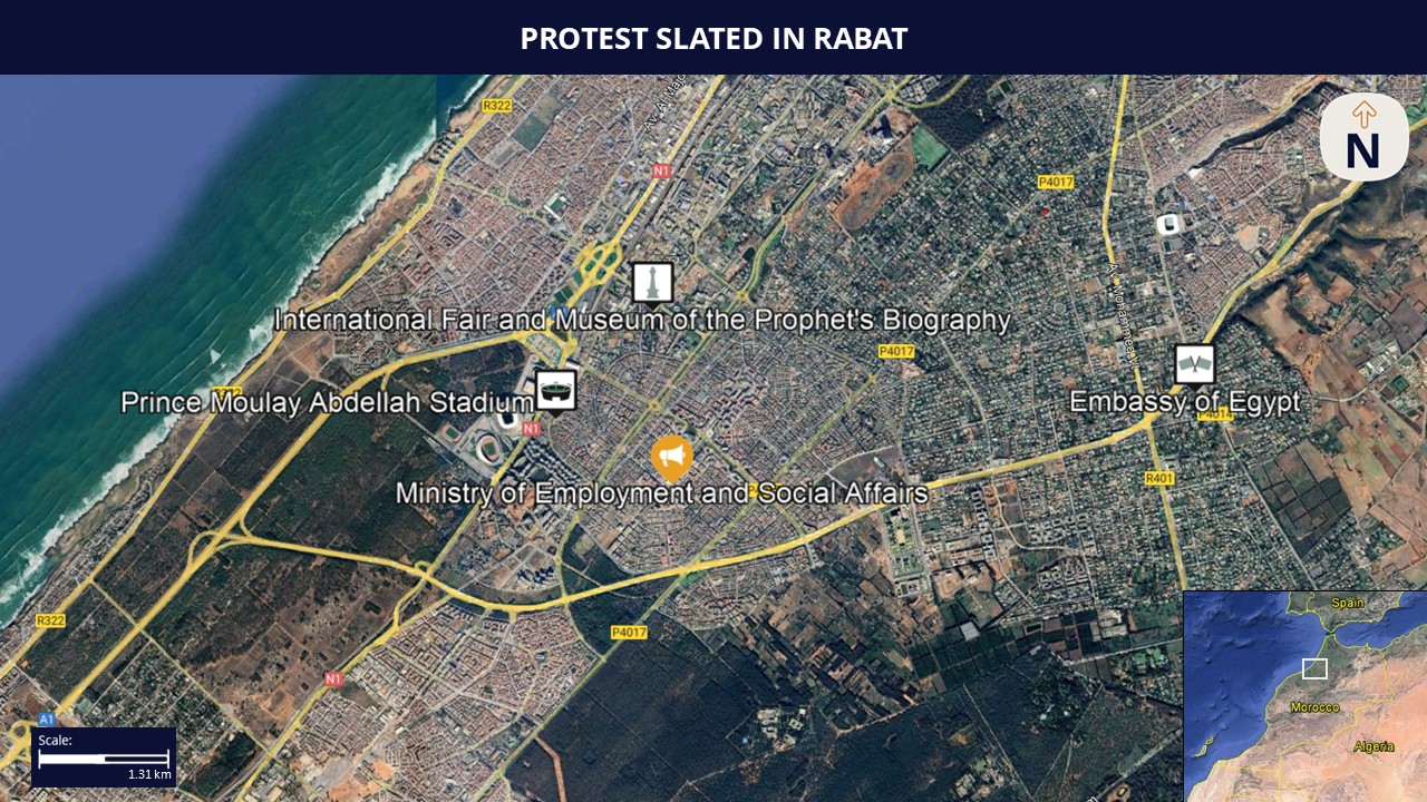 Those operating or residing in Rabat during the morning hours on December 25 are advised to maintain heightened vigilance and allot for disruptions in the vicinity of the Ministry of Employment due to the slated protest and the associated risk of unrest.